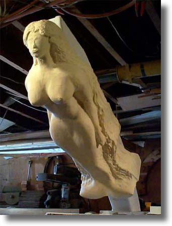 The figure head is fitted to the bow mock-up numerous times throughout the carving process to see how the figure will look in its mounted position. |