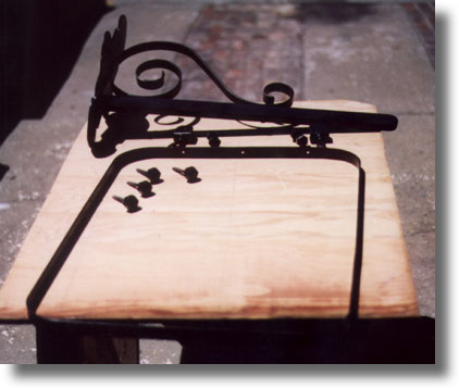 ![]() Next, stain is applied to the panel, and wiped off the logo and letters, leaving the logo colors more subdued. Patent gold leaf is applied and over coated with Chromatic UV resistant clear gloss water based finish to protect from rubbing off at the next stage. Next, another coat of matching green stain will be applied to the entire panel and selectively wiped to produce the final patina. |